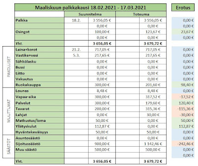 yhtään mitään, mutta ehkä se ei ole opintovapaalla tarkoituskaan. Helmikuussa käytin 2.296 euroa, joten rahat olisi loppuneet kesken. Tammikuussa 2.581 euroa. Hieman tässä on siis tekemistä, mutta onneksi suunta on alaspäin!